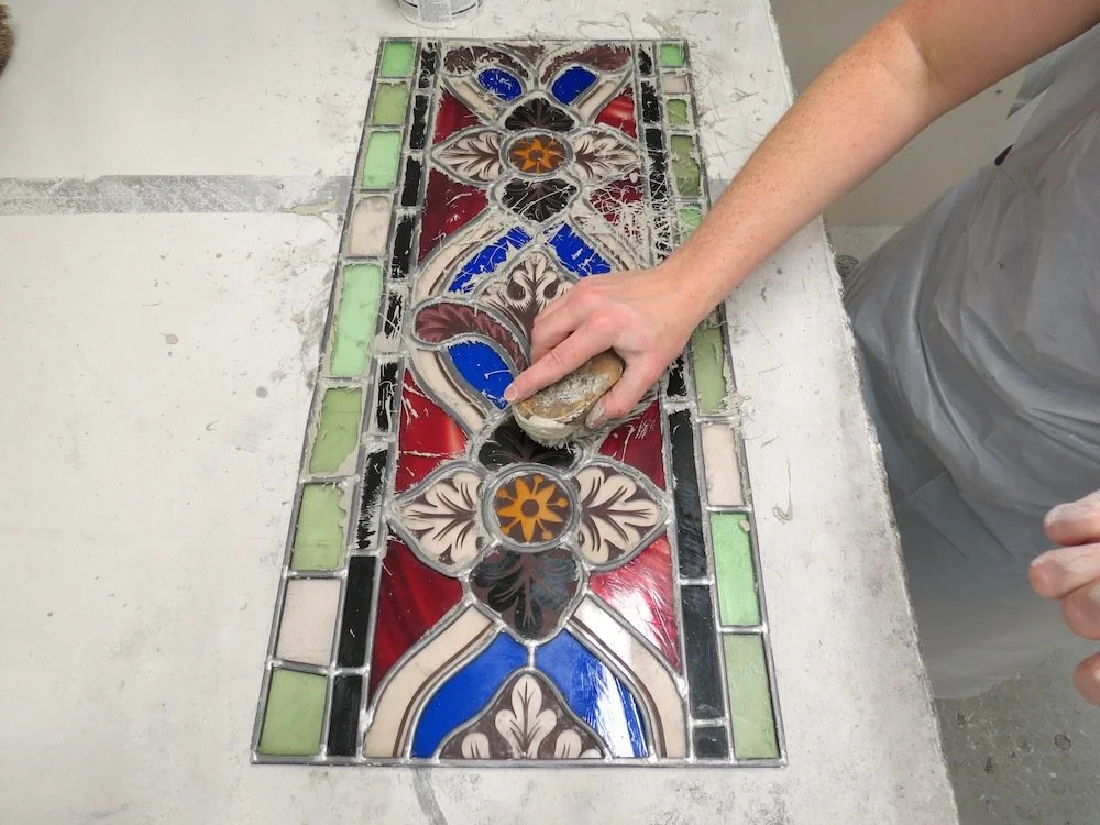 after the glass was cut and patterned, they would be painted with black pigment to make the faces, fabric folds and inscriptions. This pigment would be baked onto the glass in a kiln making it permanent.