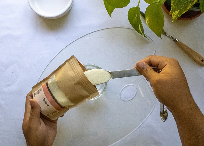 Casein is a milk protein that can make a lovely matte finish paint. It is used in addition to Borax as the binder in some distemper paint recipes. While Rosco used to carry a line of Casein paints, they became less popular due to their reversibility. Some people preferred them for this same reason.